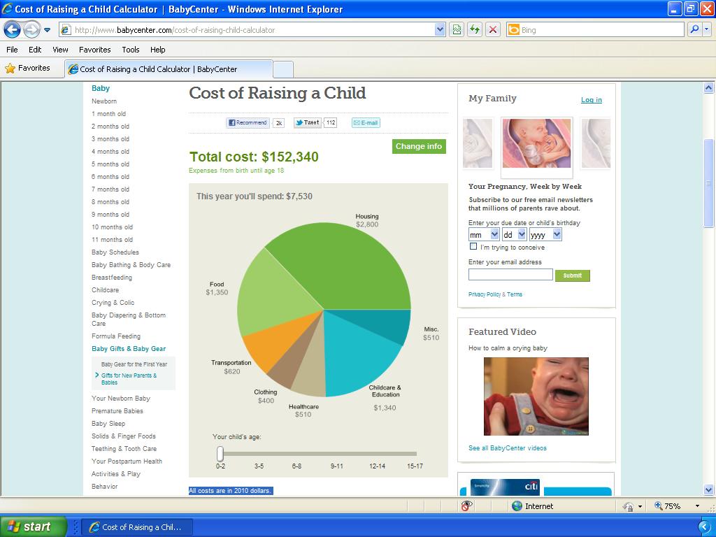 First of all, let’s estimate how much it costs to raise a newborn. According to babycenter.com , the 2010 annual price to raise a baby for a single woman in Illinois $7,530 per year**. (For comparison purposes, if you want to factor in inflation, that comes in around $6,723 per year in 2005 dollars^.)